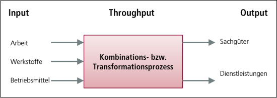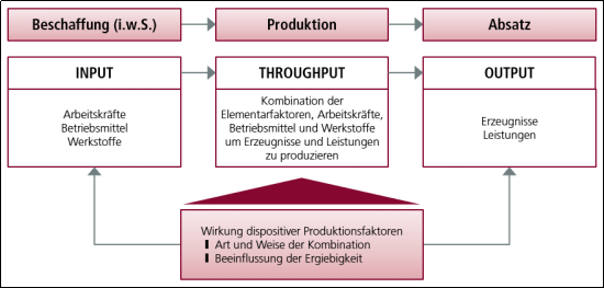 Im Folgenden wird näher erläutert, welche Funktion die einzelnen Produktionsfaktoren im Produktionsprozess wahrnehmen. Die vereinfachte Darstellung des betrieblichen Produktionsprozesses mit Input (Beschaffung), Throughput (Produktion) und Output (Absatz) wird auch als Makrostruktur des Produktionsprozesses bezeichnet.[] In Abbildung 3 wird der Einsatz der Produktionsfaktoren in der Makrostruktur des